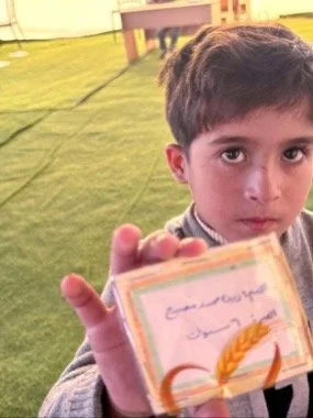 Besides the challenge of operating without many basic educational materials, there are additional considerations such as the lack of internet or even electricity. Nonetheless, educators like the one I spoke with are determined and optimistic about providing the best they can offer. It is of fundamental importance, for example, that each child feels seen and appreciated. Take a look at the photo below, in which six year-old Muhammad Musbah is shown, proudly holding his “identity card.”